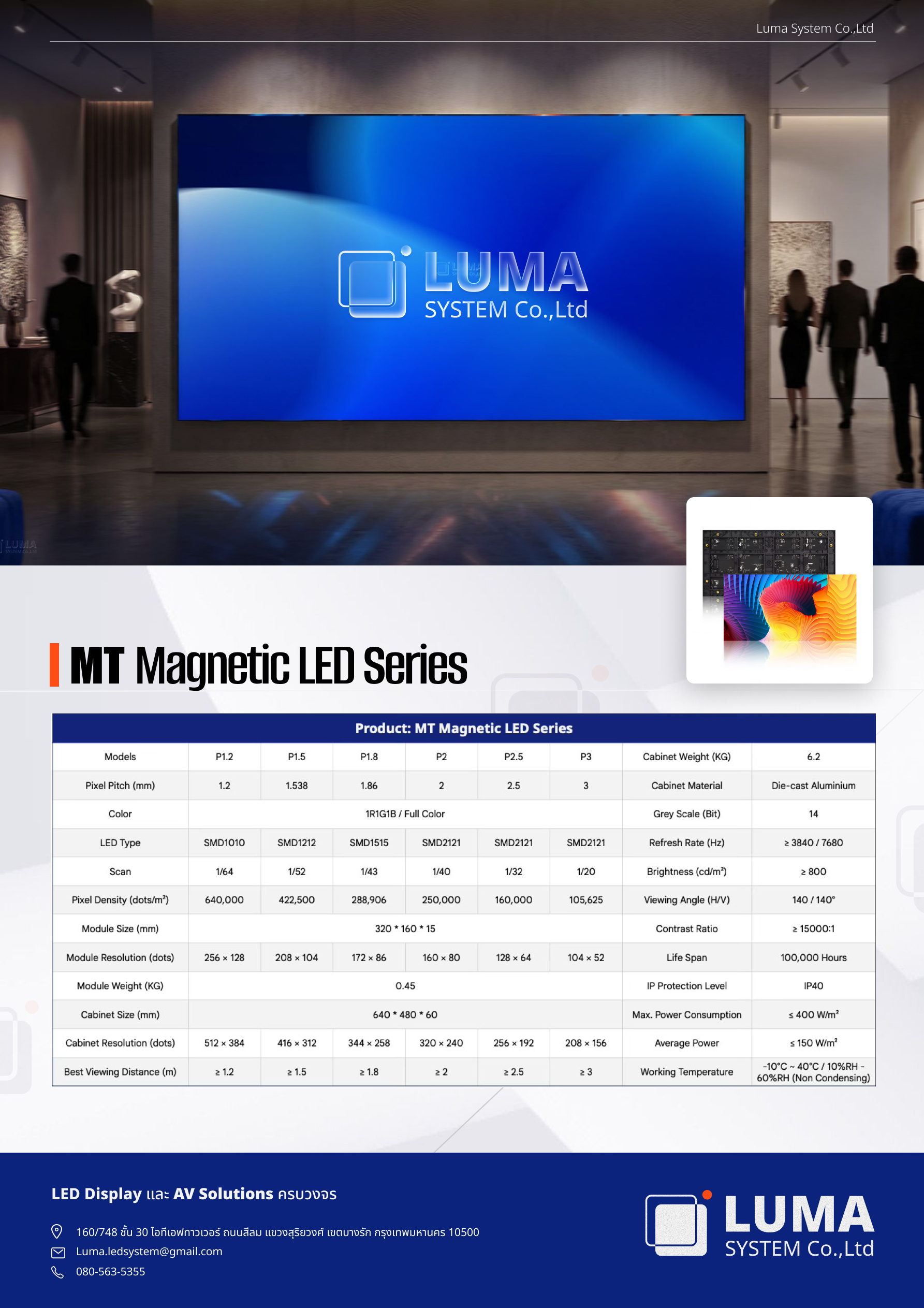 MT Series เป็นจอ LED ที่ออกแบบมาเพื่อการติดตั้งภายในอาคารโดยเฉพาะ มาพร้อมผิวจอแบบ Matt ที่ช่วยลด แสงสะท้อนให้ภาพสบายตา เหมาะสำหรับการใช้งานในพื้นที่ที่ต้องการความคมชัดและความสบายในการมองเห็นเป็นเวลานาน พร้อมทั้งช่วยประหยัดพลังงานและ รองรับการใช้งานได้อย่างง่ายดาย (User-friendly)