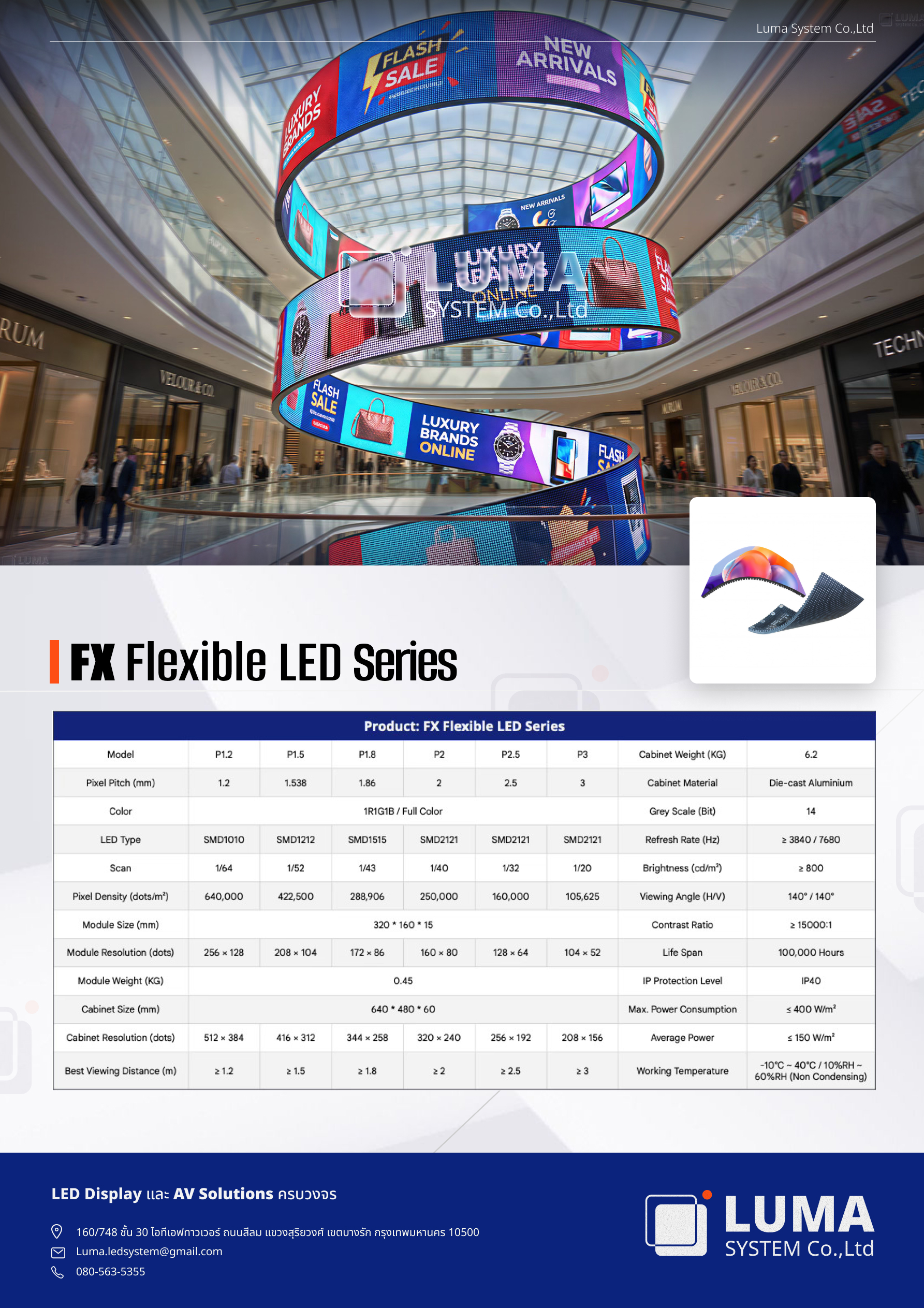 จอ LED รุ่นพิเศษที่ออกแบบมาเพื่อรองรับงานติดตั้งที่ต้องการ ความยืดหยุ่นด้านดีไซน์สามารถดัดโค้งและปรับรูปทรงได้ตามแนวคิด ของพื้นที่และงานสถาปัตยกรรมเหมาะสำหรับการใช้งานภายในอาคารโดยเฉพาะ ช่วยเปิดโอกาสให้การออกแบบพื้นที่มีอิสระและความ สร้างสรรค์มากยิ่งขึ้น มาพร้อมผิวจอแบบ Matt ที่ช่วยลดแสงสะท้อน ให้ภาพสบายตา เหมาะสำหรับการรับชมในระยะใกล้ รองรับการใช้งานต่อเนื่อง ประหยัดพลังงาน และใช้งานง่าย (User-friendly) โดยให้ภาพคมชัด สีสันสม่ำเสมอ และการแสดงผลที่เสถียร ช่วยยกระดับประสบการณ์การรับชมและเสริมภาพลักษณ์ของพื้นที่ให้โดดเด่นอย่างมีเอกลักษณ์